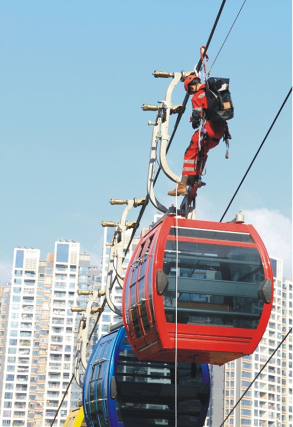 一个救援队伍由三名救援人员组成,各有分工,提高了救援效率。一般情况下,我们的救援人员能在10分钟内,到达一个吊箱,在这个吊箱内,每分钟就能再救援一名游客到达安全地带。
