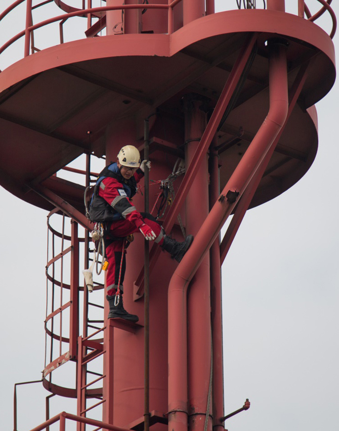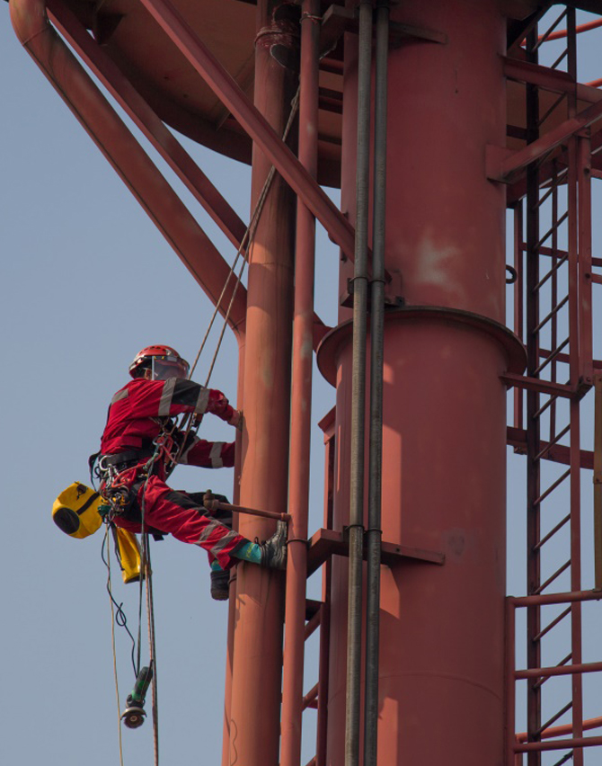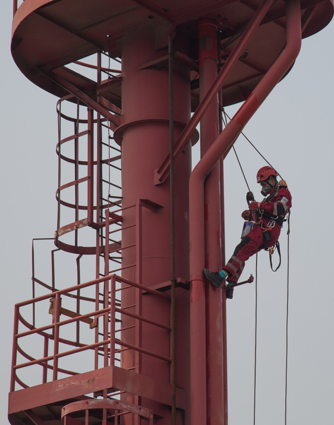 服务说明:采用绳索技术对陶氏化工码头南消防塔和北消防塔防腐作业。